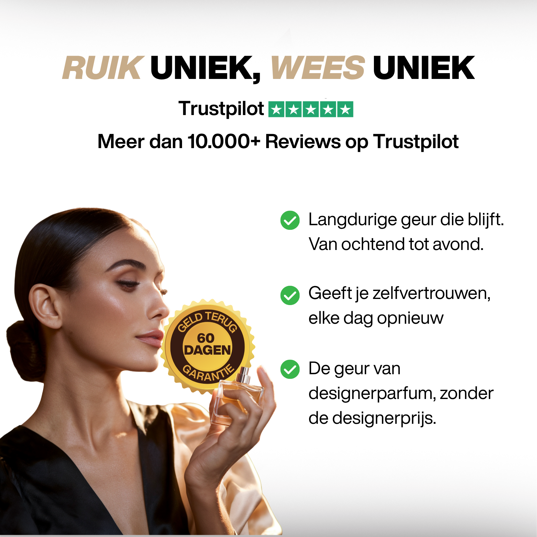 Jouw Risicovrije Garantie: Probeer je gekozen geur met volledig vertrouwen. Ben je er binnen 30 dagen niet helemaal verliefd op? Stuur hem gewoon terug voor een volledige, probleemloze terugbetaling.
