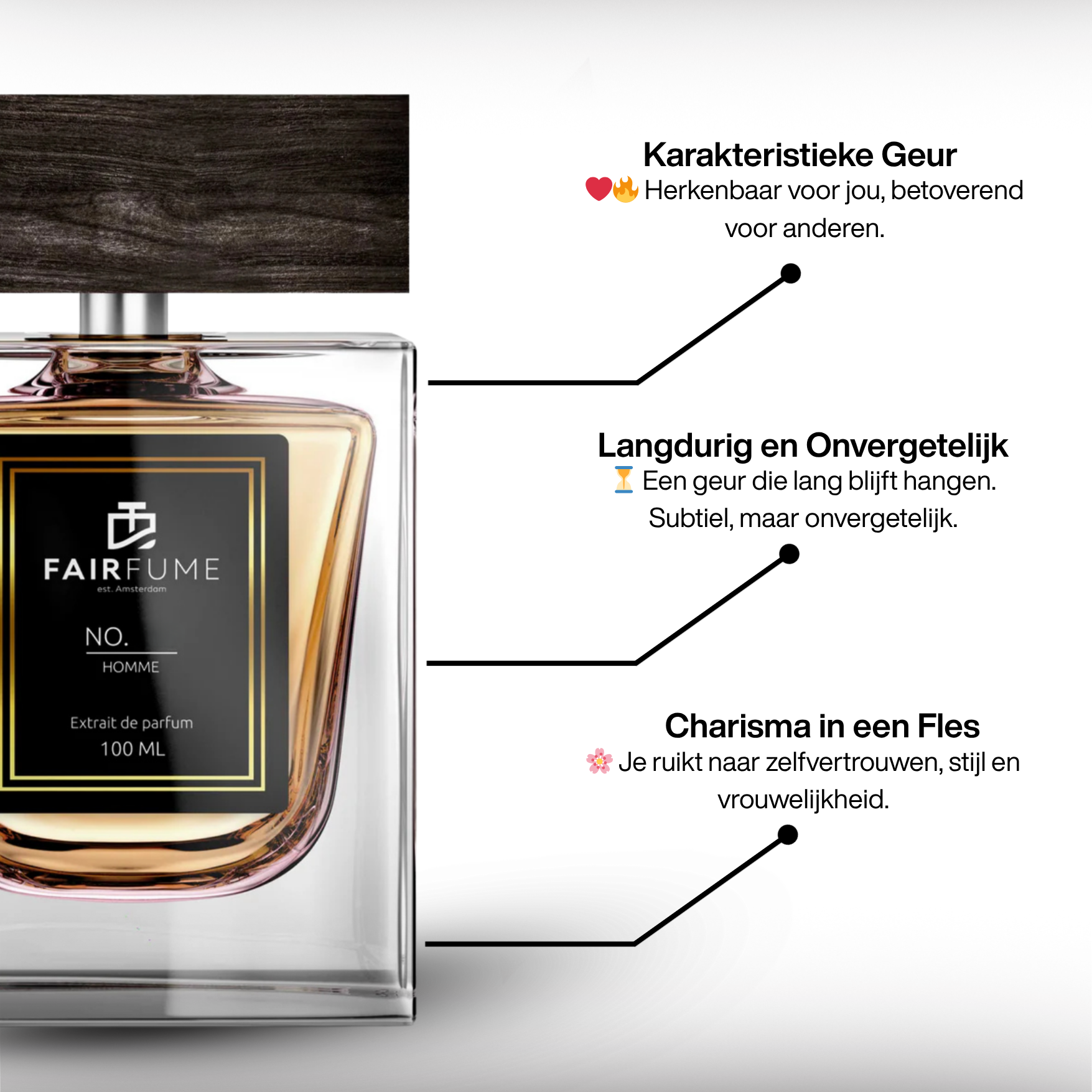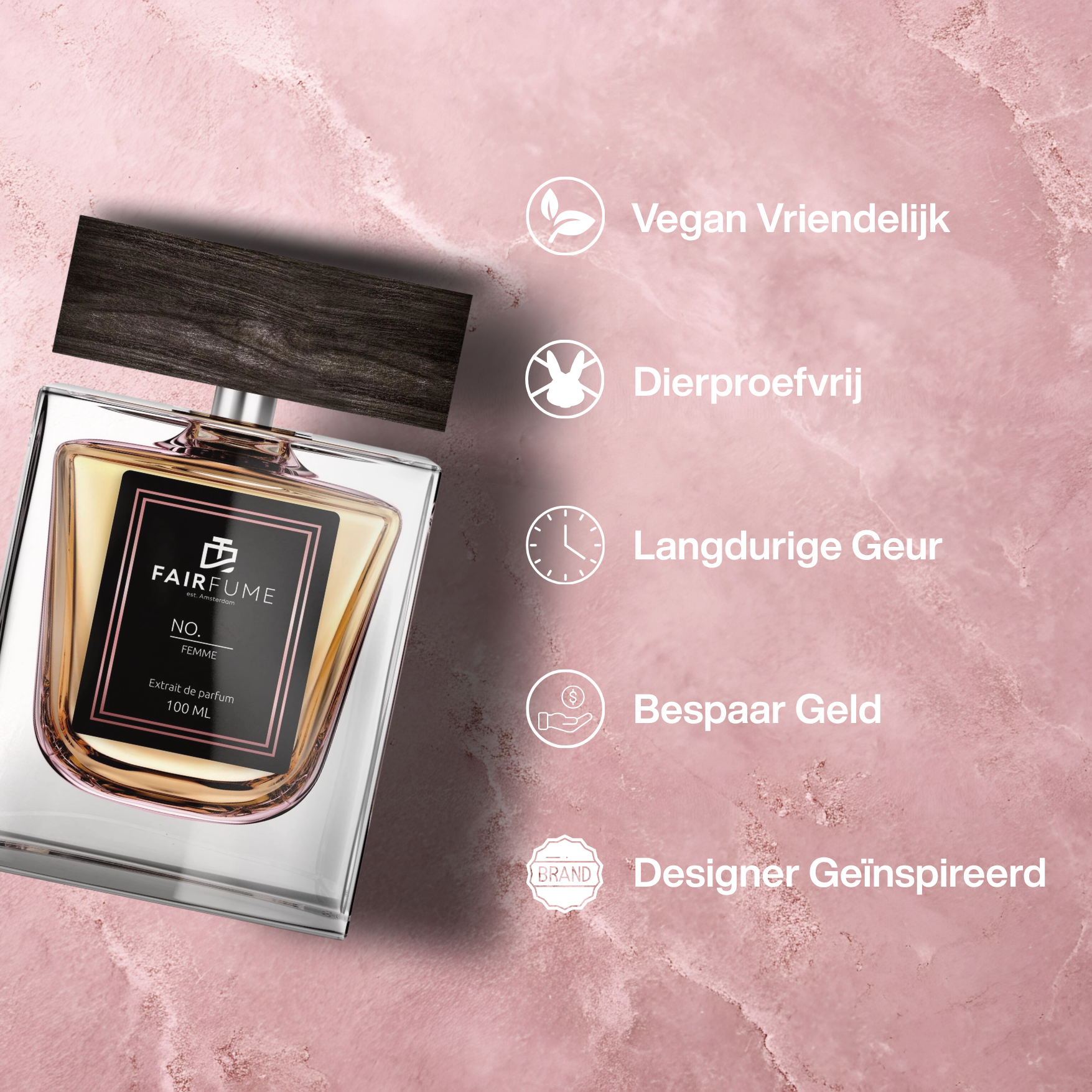 Onze geuren zijn enkel geïnspireerd op deze creaties en zijn niet identiek aan enig ander parfum of origineel. Fairfume mag niet worden verward met de originele merken en heeft geen enkele band met de fabrikanten van de genoemde of niet-genoemde designermerken.